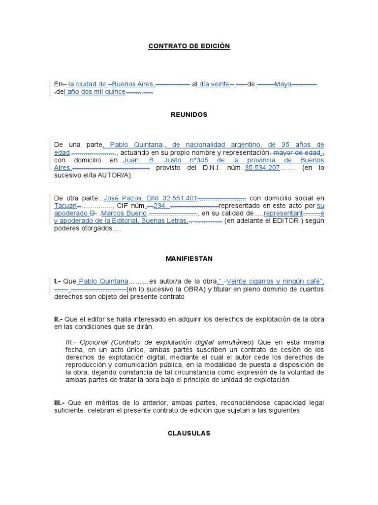 Ejemplo De Contrato De Edicion Publicacion Derechos De Autor