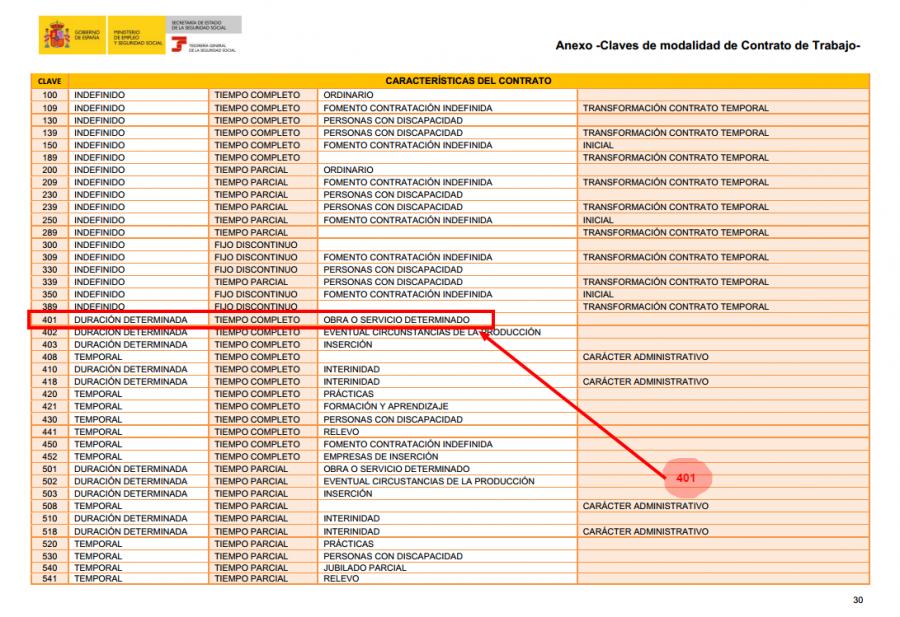 De no observarse la exigencia de forma escrita el contrato de trabajo se presumir celebrado por tiempo indefinido y a jornada completa salvo prueba en contrario que acredite su naturaleza temporal o el carcter a tiempo parcial de los servicios. PROTECCIN DE DATOS. Cdigo de contrato tiempo completo tiempo parcial 401 4 10 obra o servicio determinado interinidad obra o servicio determinado interinidad 501 5 1 0 cdigo de contrato ministerio de trabajo e inmigracin servicio pblico de empleo estatal datos de la cuenta de cotizacin rgimen cod.