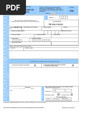 La tasa 790 cdigo 026 tambin es conocida como Tasa por solicitud de nacionalidad espaola por residencia y carta de naturaleza para sefardes originarios de Espaa. La Tasa del Modelo 790 cdigo 012 la debes pagar en procedimientos tales como el registro de ciudadanos de la Unin Europea UE expedicin de documentos de identidad para extranjeros ampliacin de visados o bien de estancias cortas y permisos de retorno entre otros trmites.