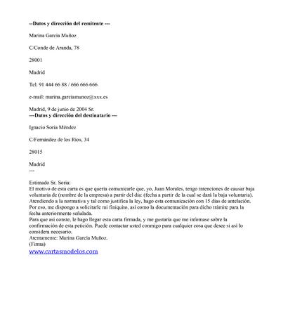 Este documento debe ser presentado con un preaviso de 15 das. Modelo de carta de baja voluntaria.