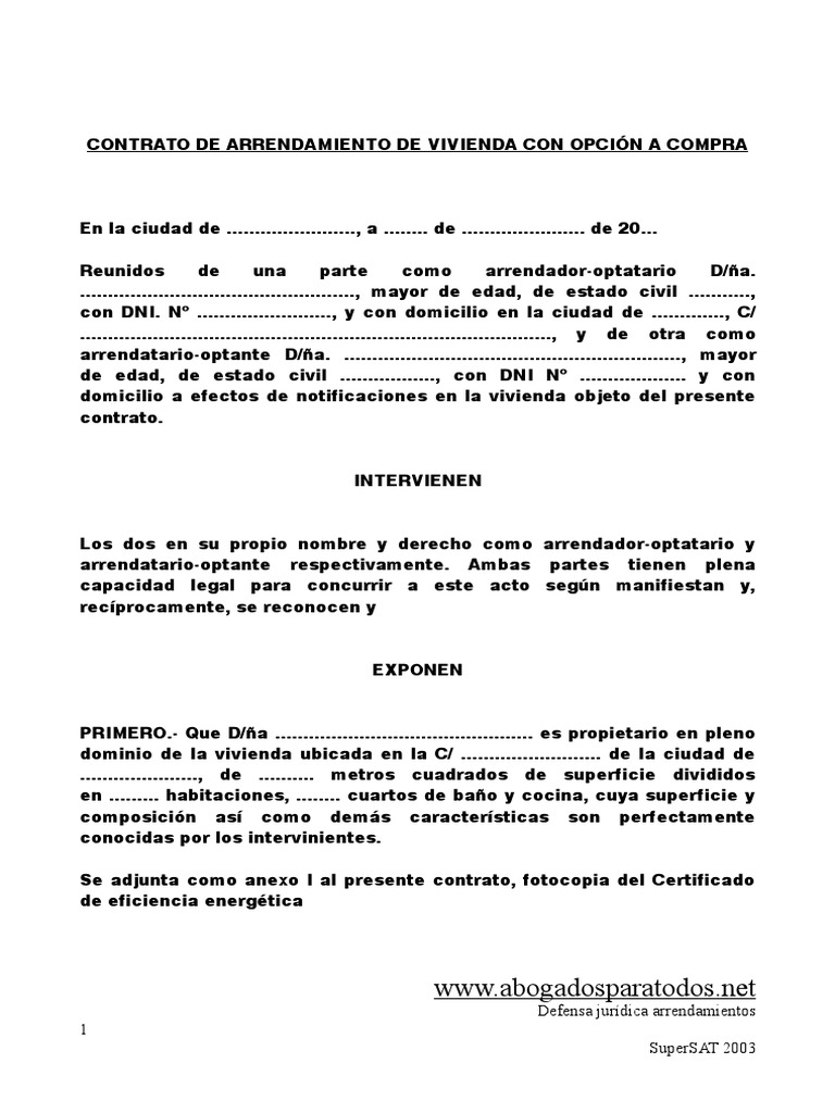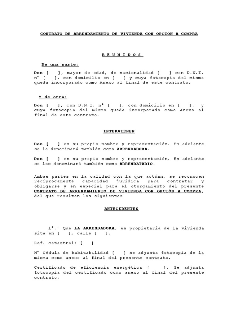 CONTRATO DE ARRENDAMIENTO DE VIVIENDA CON OPCIN A COMPRA REUNIDOS De una parte. Es la mejor opcin para asegurarte de utilizar un documento adecuado personalizado y ajustado a la ley sin tener que recurrir a un abogado. Quien eche mano del Cdigo Civil para revisar las condiciones generales del contrato de alquiler con opcin a compra no encontrar en l lo que buscaEsto es as porque esta figura se caracteriza por ser un contrato considerado atpico segn el Tribunal Supremo que no queda recogida en este conjunto de normas que s le son.