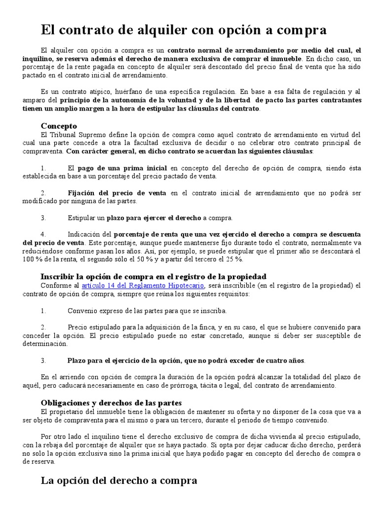 Por obvios motivos todo lo relacionado con respecto a esa opcin de compra que se guarda el husped debe quedar bastante clara en el contrato firmado as no tendran inconvenientes al momento de la compra. Y cuya fotocopia del mismo queda incorporado como Anexo al final de este contrato. Una de las modalidades del contrato de alquiler de vivienda es el de alquiler con opcin a compraEn este tipo de contrato se incorpora una clusula por la cual el arrendador puede ejercer un derecho de compra sobre la vivienda en un plazo que se especifica en el contrato.