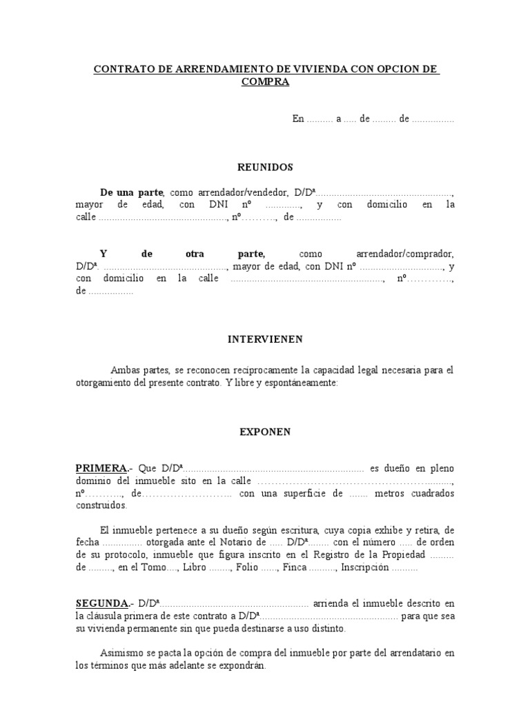 Modelo contrato alquiler opcion compra. Este modelo de contrato de alquiler de vivienda con opcin a compra es una herramienta legal si te encuentras en la situacin de arrendar una vivienda y en un futuro cercano quieres adquirirla. Descargar Contrato con opcin a compra de Arrendamiento o Alquiler de Vivienda en PDF o Word. Don con DNI.