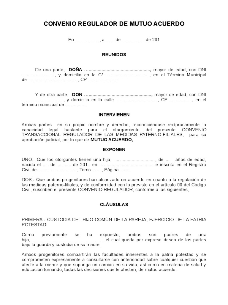 No obstante este Convenio Regulador tendr plenos efectos desde sufirma. MODELO DE CONVENIO REGULADOR CON EJERCICIO EXCLUSIVO DE LA CUSTODIA Nota- Convenio regulador de medidas paternofiliales regulando la guarda y custodia exclusiva de los hijos menores de edad conforme a la Ley 72015 de 30 de junio de relaciones familiares en. Ambas partes convienen de mutuo acuerdo los siguientes.